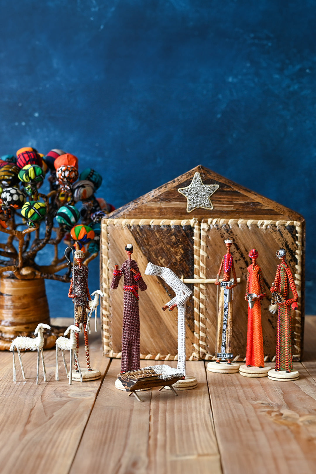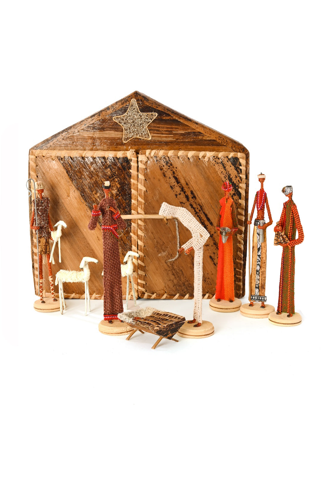 Kenyan artisans utilize abundant banana palm leaf fiber to create unique collectibles. This sweet nativity scene is handcrafted from a variety of rustic materials, including banana fiber, wire, cardboard, corn husk, fabric and wood. Featuring the holy family, three wise men, a shepherd and two sheep, the scene is presented in a beautiful handcrafted banana fiber stable adorned with a beaded star. Each piece is handcrafted to be one-of-a-kind.