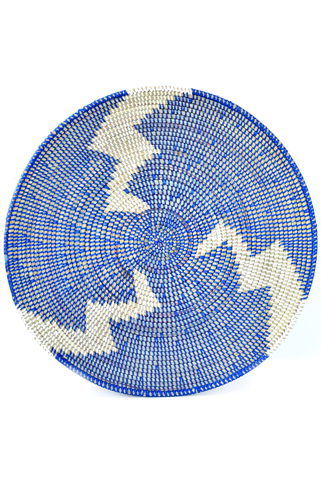 Wolof women in rural Senegal craft these eye-catching baskets from cattail stalks and strips of plastic used in the production of outdoor mats. White bolts of lightning stand out against a dark blue background.