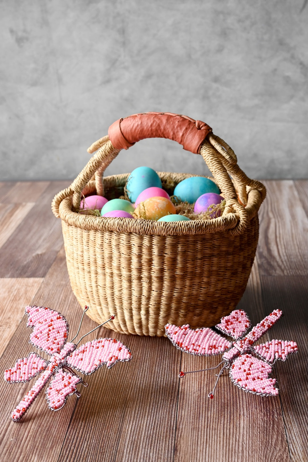 This sweet butterfly sculpture is crafted from recycled metal wire and glass beads in shades of pink which are sprinkled with multi-color beads as a cheery accent.