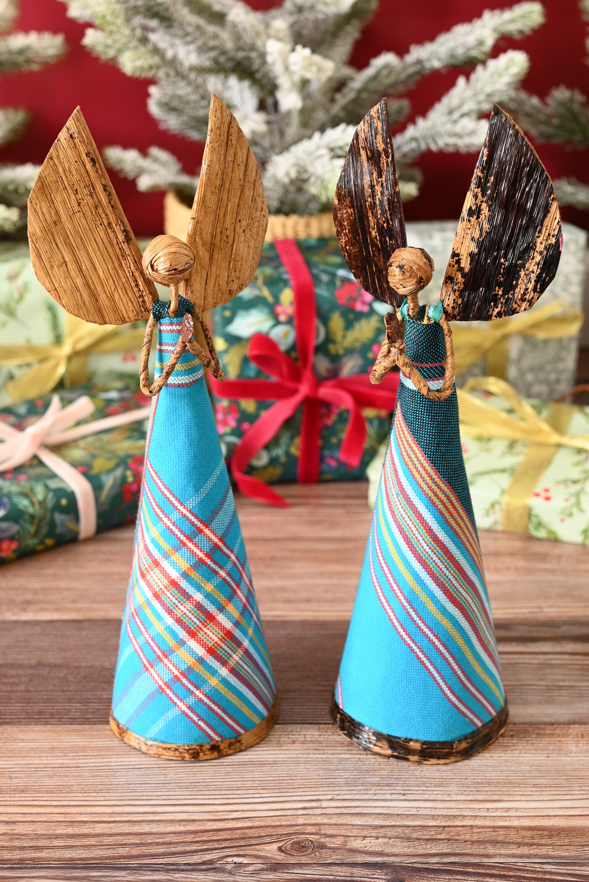 Kenyan artisans craft these beautiful angel holiday sculptures from traditional, woven kikoi textile and banana fiber. Using natural materials allows artisans to earn income with no stress on their environment, and the rustic nature of these handcrafted sculptures adds a distinctive natural touch to holiday decor.