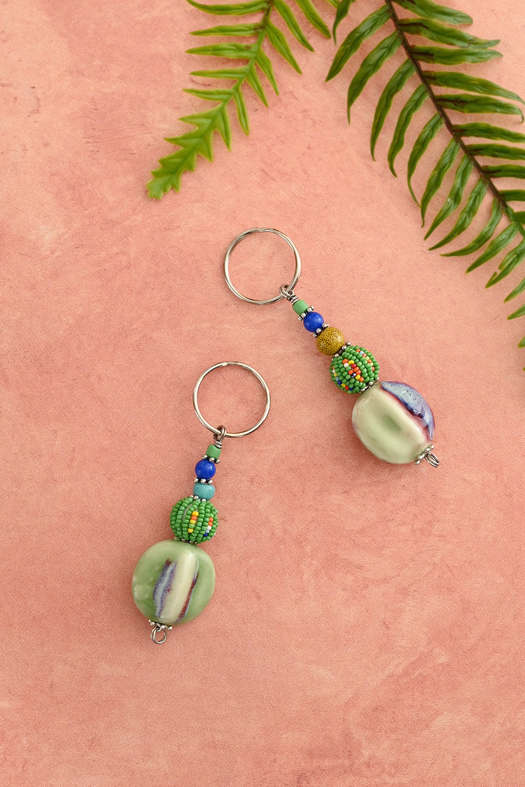 Handcrafted by artisans in Kenya, this vibrant keychain features a playful stack of glass, beaded, and ceramic beads. Metallic spacers add a touch of shine and detail, while a sturdy split ring keeps your keys secure. Each keychain is a unique, joyful accent for your bag or keys.
