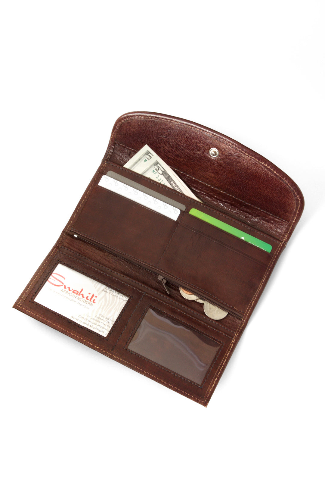 These handcrafted wallets feature handmade bogolan, or mudcloth fabric, from Mali. The body of the wallet is constructed from soft leather. Interior includes 3 long compartments, 4 slots for credit cards, 2 card slots with clear plastic windows, and a long zippered change compartment.