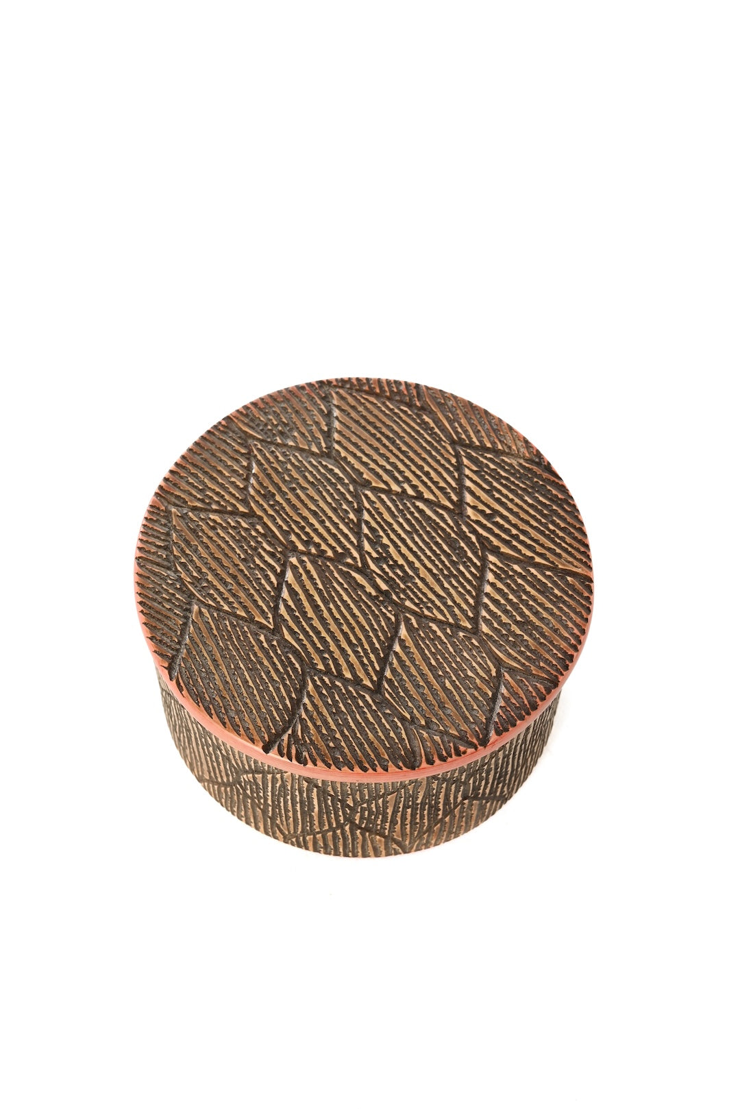 Carvers in Kenya's western highlands craft the basic form for a lidded storage box from soft soapstone. Artisans in a Nairobi workshop then add a rust-orange dyed finish and leaf inspired etched details.