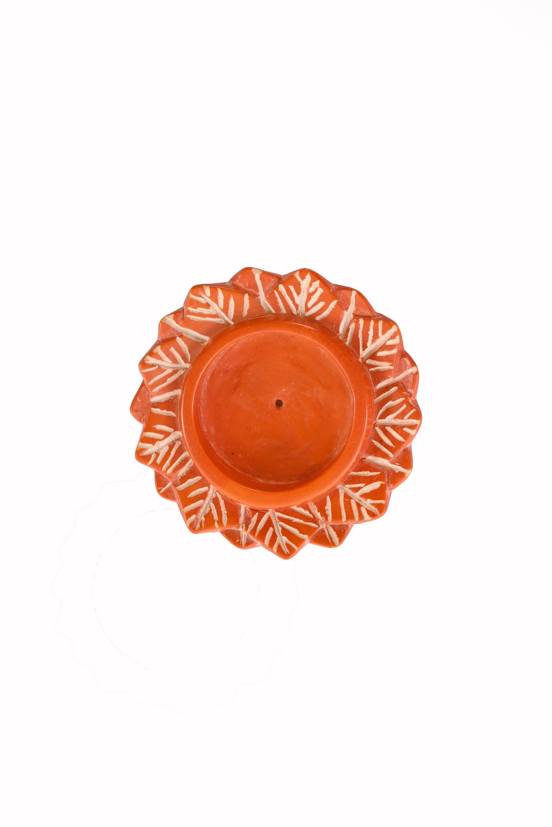 Carvers in Kenya's western highlands craft this tea light candle holder from soft soapstone. Artisans in a Nairobi workshop then add a cheerful orange dyed finish and etched leaf details. Can also be used to hold a stick of incense.