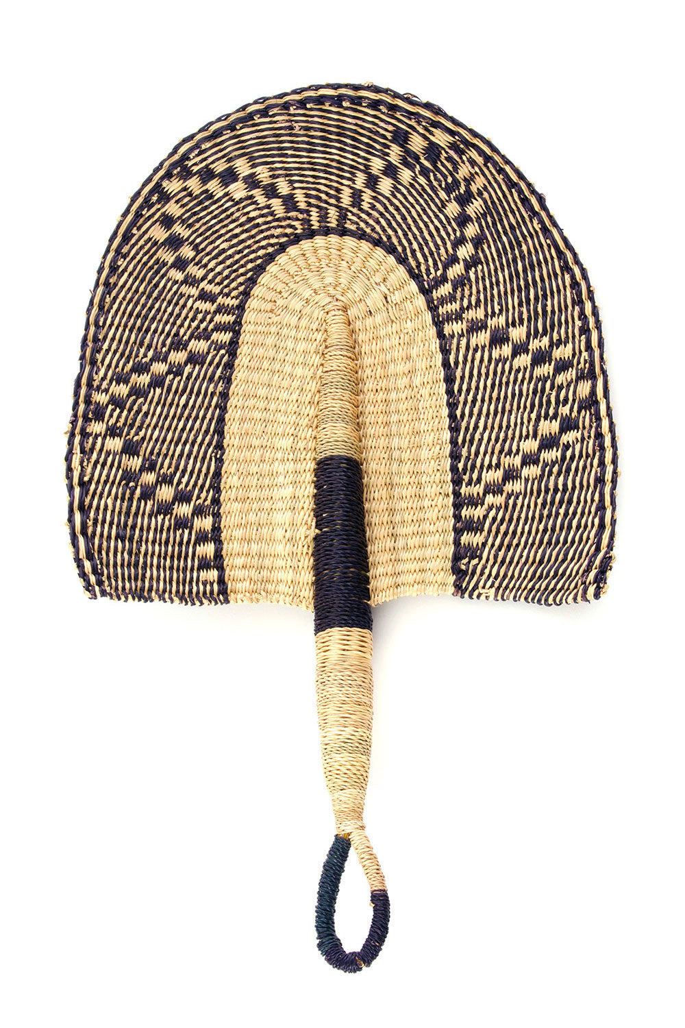 Talented weavers in Ghana's northern Bolgatanga region craft beautiful hand fans from elephant grass. Weavers create lovely assorted designs using natural and dyed dark blue strands of grass. The fan doubles as wall art when not in use.