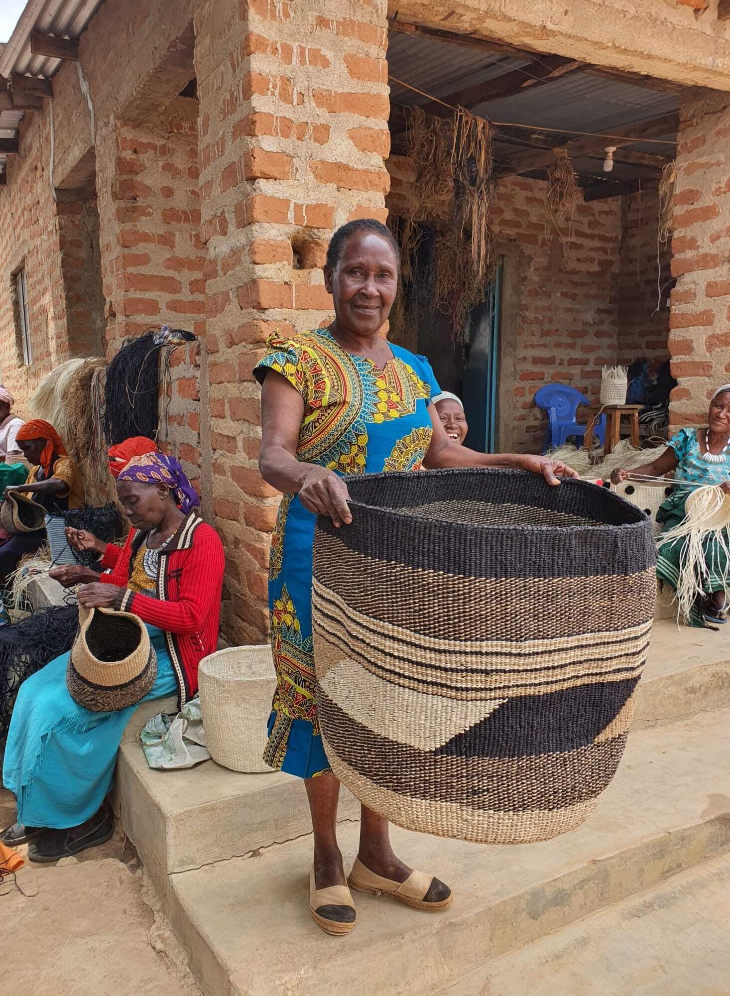 In the rural Kenyan countryside around the city of Kitui, women specialize in weaving the tough fibers of the agave sisalana plant. Sisal's spiky leaf clusters erupt from a dry landscape and often requires long journeys to gather. Once woven, these womens' totes are sold to local and international markets. Singing, dancing, and chatting make weaving for export an enjoyable social event!