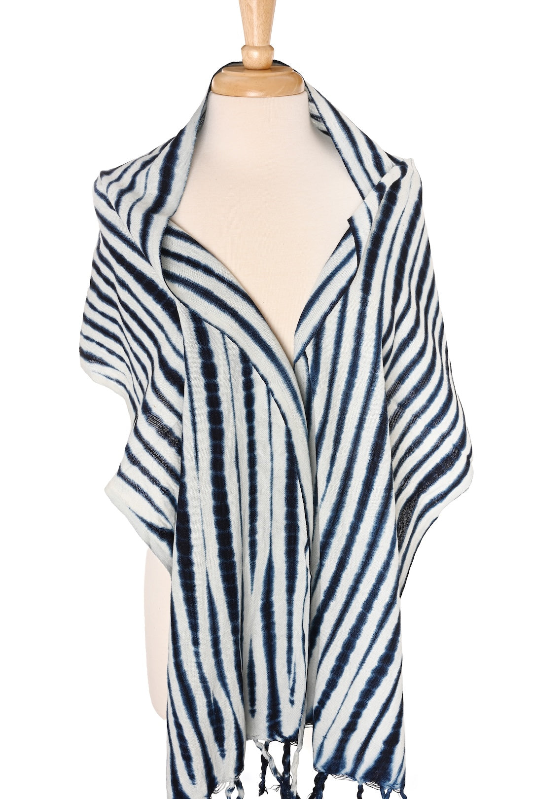 Lightweight with fringe at the edges, this versatile wrap can be worn as a scarf or shawl, adding an artful touch to any look.