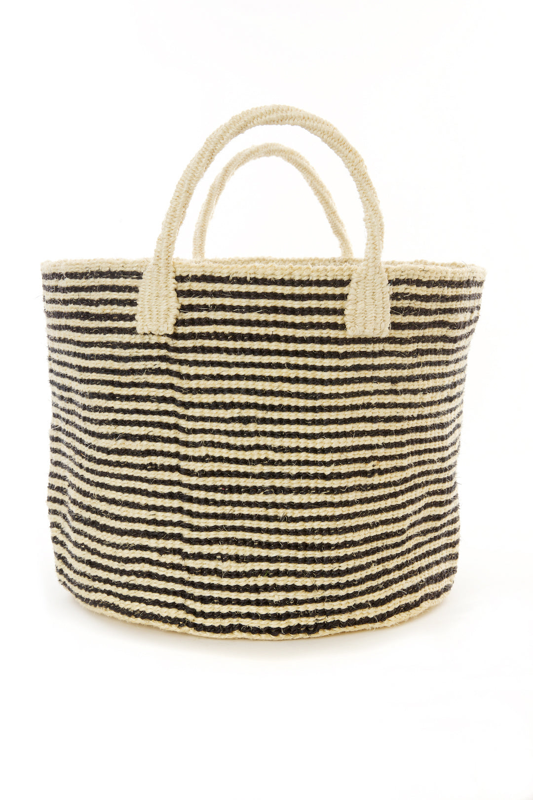 These classic totes are woven from long strips of fiber extracted from the sisal plant, in alternating rows of inky black and natural white. Simple woven sisal handles make this a 100% sustainable accessory.