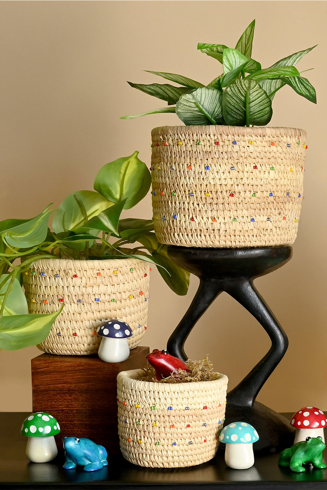 Nomadic baskets are sold in three useful nesting sizes and are dotted with muliti-color beads. Because these baskets are handcrafted, each will vary slightly.