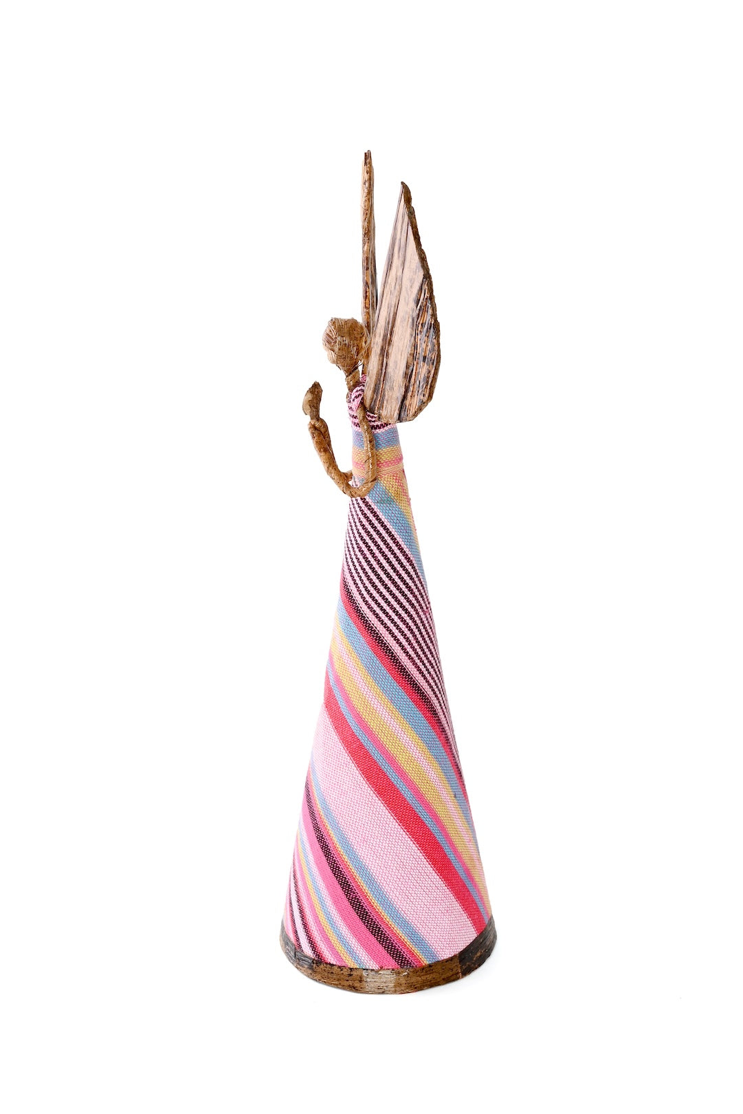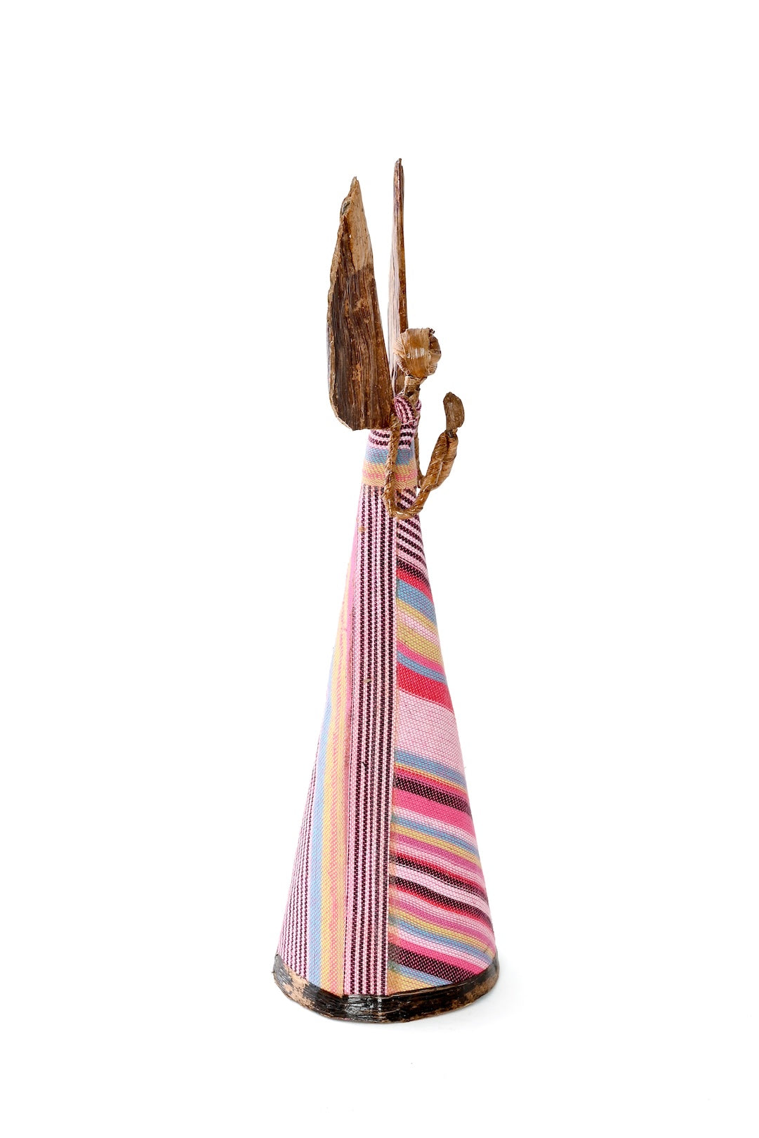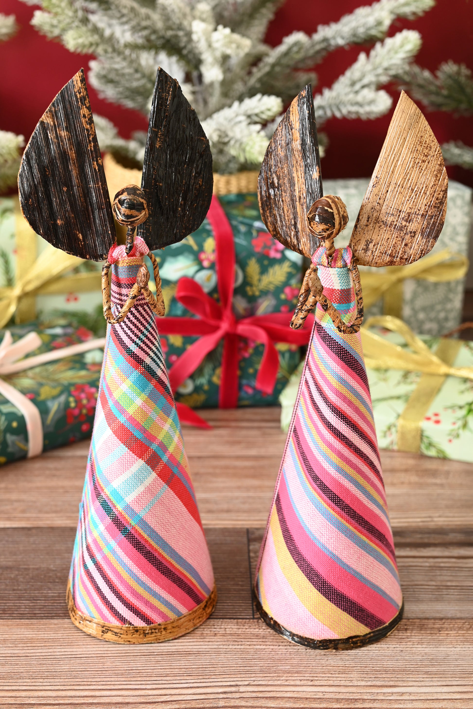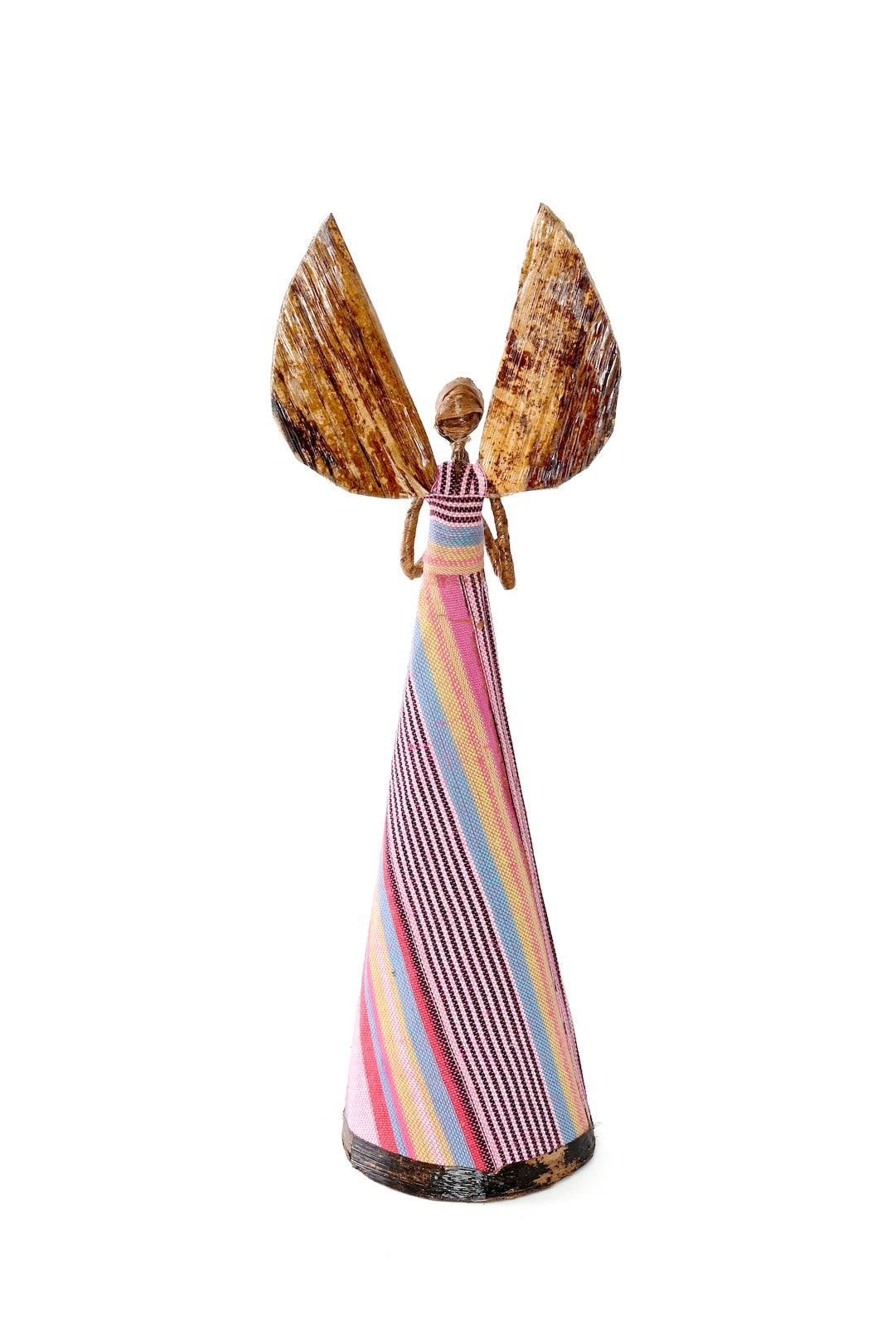 Kenyan artisans craft these beautiful angel holiday sculptures from traditional, woven kikoi textile and banana fiber. Using natural materials allows artisans to earn income with no stress on their environment, and the rustic nature of these handcrafted sculptures adds a distinctive natural touch to holiday decor.