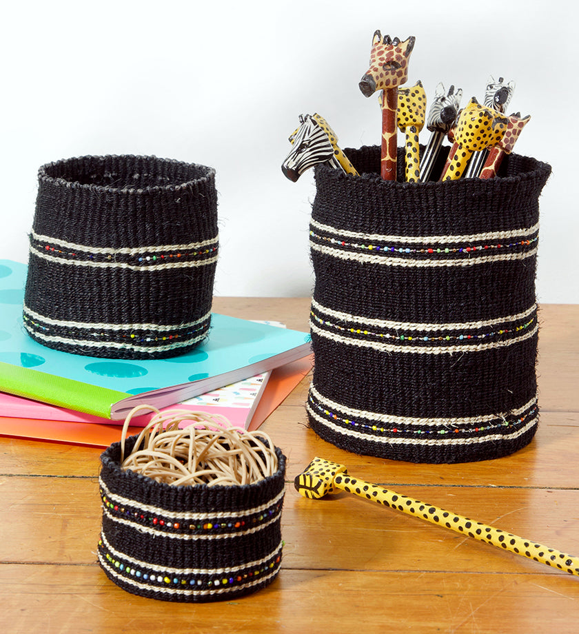 These three little nesting storage baskets, handcrafted in Kenya from the fiber of the agave sisalana plant and dyed a bold classic black, are dressed up with colorful beads and can be used to store small items throughout the home.
