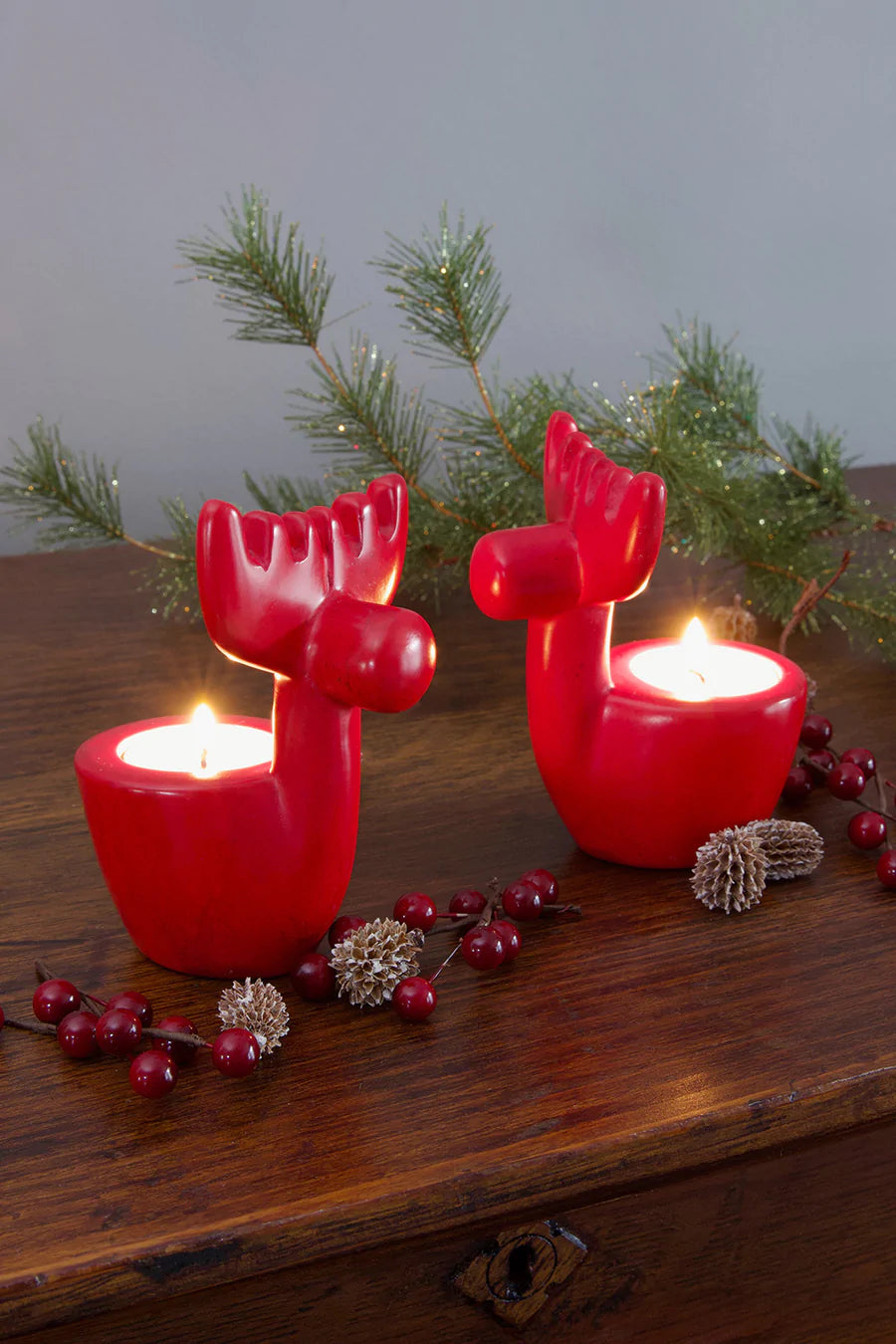 These jolly reindeer are carved from solid soapstone in western Kenya. Nairobi artists hand-dye the surface to a rich red.