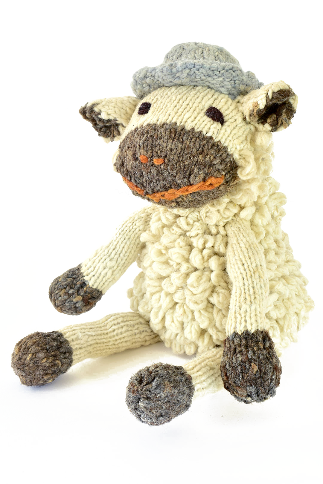 The cutie Shamba Sheep is handmade from naturally-dyed spun wool. Features an attached cozy hat, sewn facial features, and a textured wooly coat.