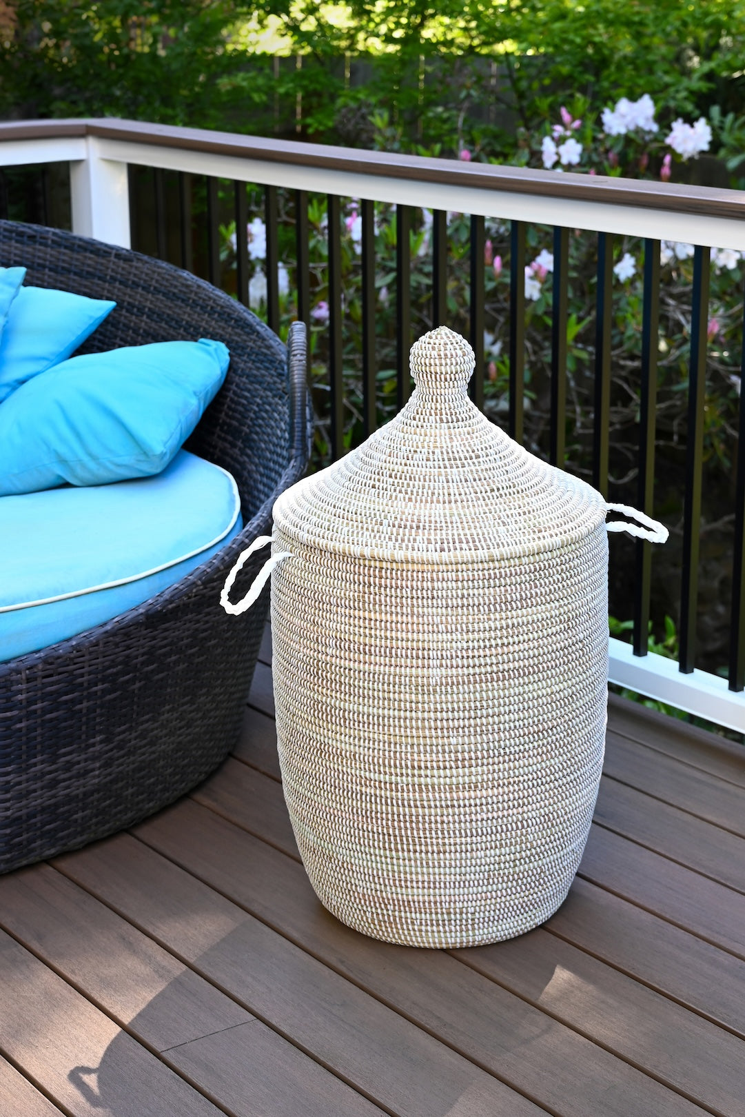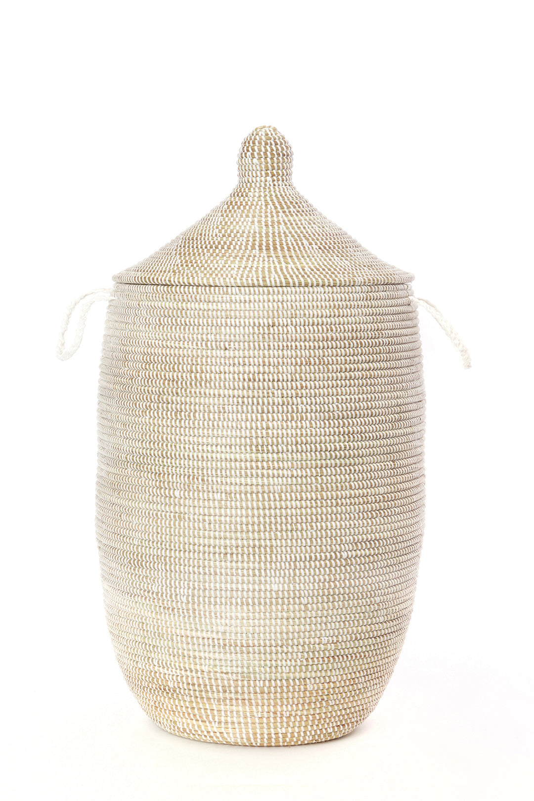 With fitted lids and braided handles, handwoven laundry hampers bring amazing artisan craftsmanship into our living spaces. This taller, slim basket is woven in Senegal by highly skilled Wolof weavers using white plastic strips and natural cattail grass stalks.