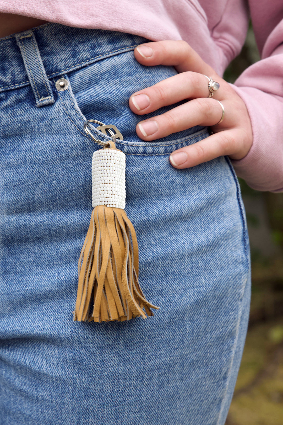 Kenyan artisans craft these unique key rings by binding soft strips of leather with hundreds of glass beads. Simple, durable and eye-catching, our Wayfarer keychains are a perfect accessory for those who prefer larger key fobs.