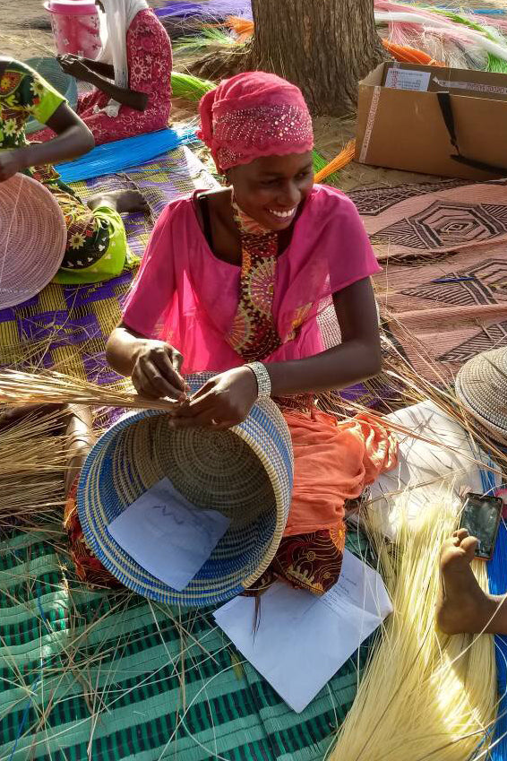 Since 2008, Swahili African Modern has worked with a group of talented Wolof weavers in remote Senegal to design hampers and baskets woven from the salvaged plastic strips and cattail stalks. First introduced by the Peace Corps, our partnership with more than 120 Wolof women shows that cooperative, home-based craft export is an excellent way for rural women to earn fair trade incomes that build healthy communities.