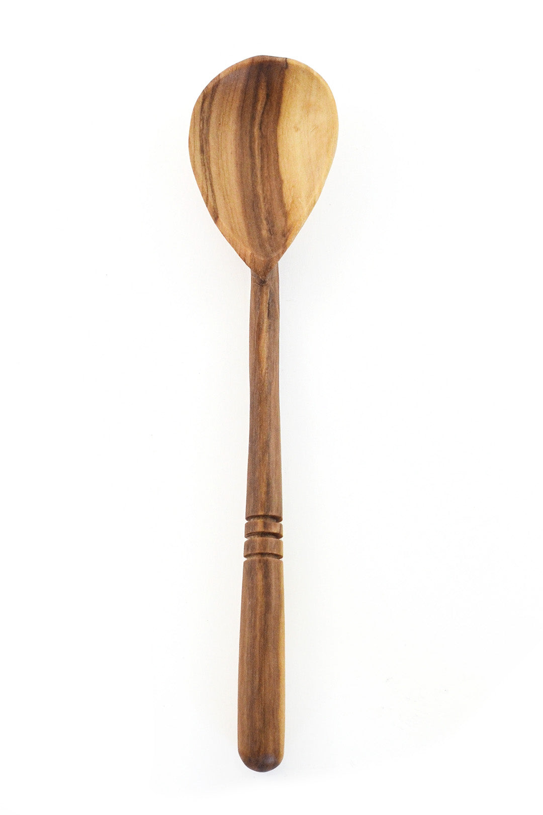 Skilled Kenyan wood carvers showcase the beautiful grain of sustainably-sourced wild olive wood. With a neatly contoured scoop, balanced handle and carved banding, this all-natural serving spoon is a lovely addition to the tabletop.